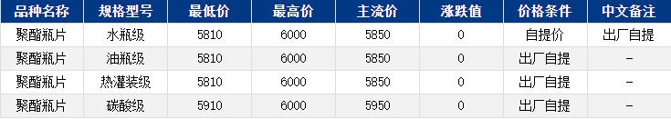 華東聚酯瓶片收于5850元/噸,漲跌值0元/噸,成本早間偏暖,聚酯瓶片工廠報盤部分上漲20元/噸,然而隨著成本支撐走弱,詢盤下滑,重心總體僵持運行。9-11月貨源報盤5810-6000元/噸,9-11月合約報盤2511升水20-60,較低2511貼水0-50;詢盤5810-5870元/噸,較高5870-5900元/噸,9-11月合約遞盤2511貼水40-60,較高貼水0-20。