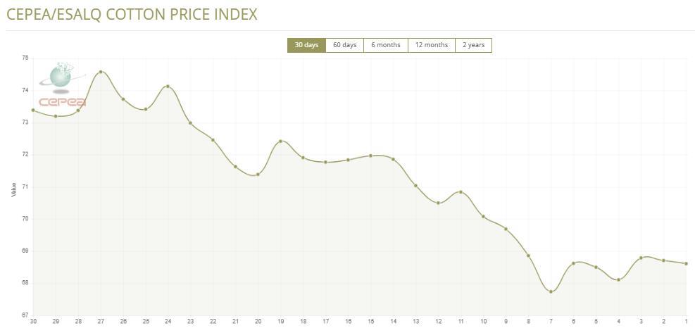 9月17日(周三),巴西CEPEA/ESALQ棉花價(jià)格指數(shù)報(bào)68.61美分/磅,較前一交易日下跌0.15%,較上月同期下跌4.52%。