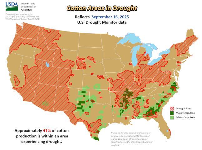美國農(nóng)業(yè)部(USDA)下屬的首席經(jīng)濟(jì)學(xué)家辦公室(OCE)當(dāng)?shù)貢r間周四根據(jù)當(dāng)日發(fā)布的美國旱情監(jiān)測圖整理的美國農(nóng)業(yè)旱情文件顯示,截至9月16日當(dāng)周,大約41%美棉產(chǎn)區(qū)受到干旱影響,高于之前一周的32%。