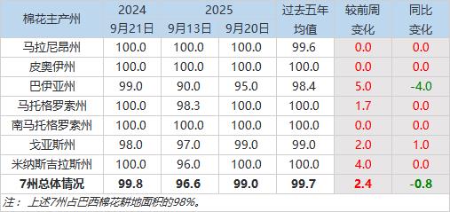 巴西新棉收割進(jìn)入尾聲,整體進(jìn)度略慢于正常水平,馬拉尼昂州、皮奧伊州、馬托格羅索州、南馬托格羅索州、米納斯吉拉斯州已收割完畢,進(jìn)展最慢的巴伊亞州收割率為95%。