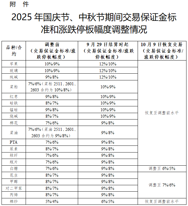 根據(jù)《鄭州商品交易所期貨交易風險控制管理辦法》第八條規(guī)定,經(jīng)研究決定,對2025年國慶節(jié)、中秋節(jié)期間部分期貨合約交易保證金標準和漲跌停板幅度作出如下調(diào)整: