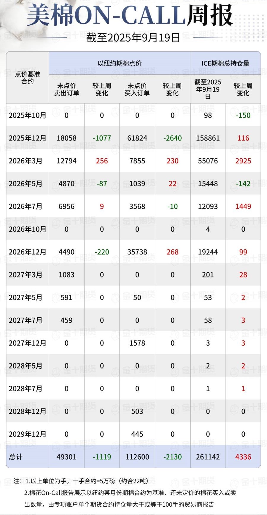 據(jù)美國商品期貨交易委員會(huì)(CFTC)最新數(shù)據(jù),截至9月19日,①美棉On-Call未點(diǎn)價(jià)賣出訂單49301手,環(huán)比減少1119手;未點(diǎn)價(jià)買入訂單112600手,環(huán)比減少2130手;②ICE期棉2510合約上賣方未點(diǎn)價(jià)合約為0手,環(huán)比增加0手;③ICE期棉2512合約上賣方未點(diǎn)價(jià)合約為18058手,環(huán)比減少1077手;④ICE期棉2603合約上賣方未點(diǎn)價(jià)合約為12794手,環(huán)比增加256手;⑤ICE期棉2605合約上賣方未點(diǎn)價(jià)合約為4870手,環(huán)比減少87手;⑥ICE期棉2607合約上賣方未點(diǎn)價(jià)合約為6956手,環(huán)比增加9手;⑦ICE棉花期貨盤面2025/26年度(8月至次年7月)的On-Call合約未點(diǎn)價(jià)賣出訂單為42678手,環(huán)比減少899手。