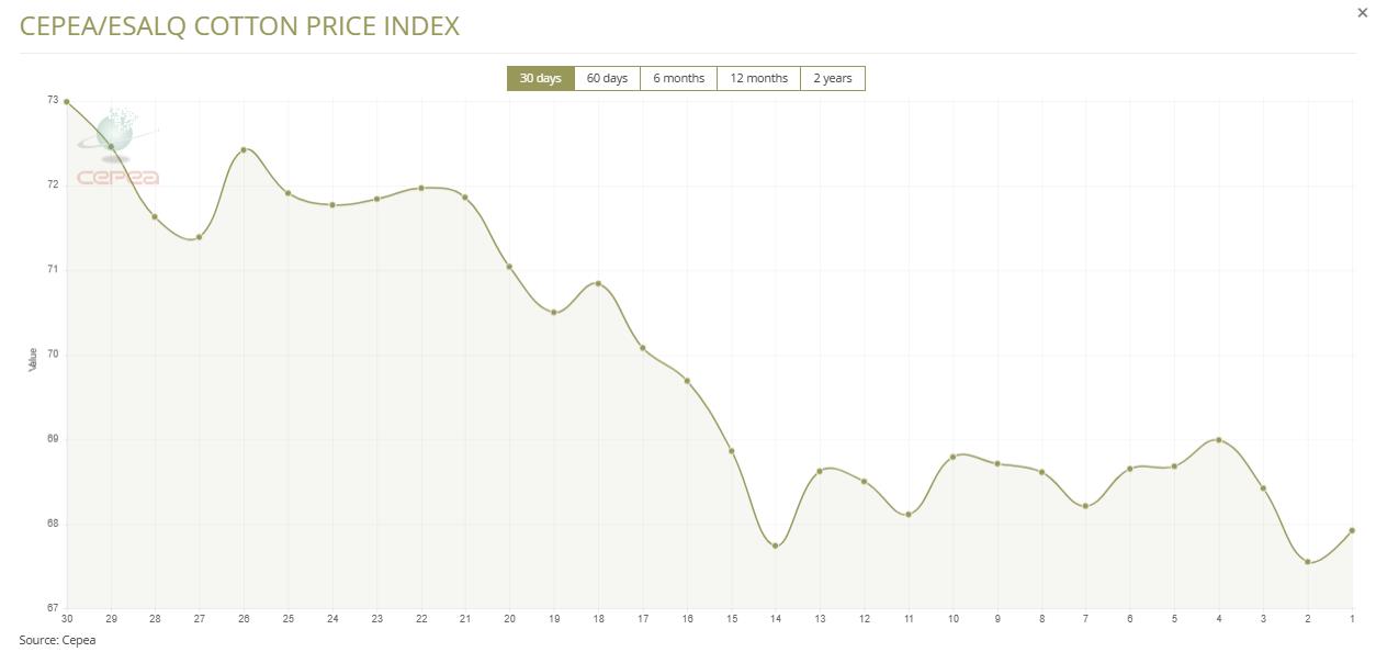 9月26日(周五),巴西CEPEA/ESALQ棉花價(jià)格指數(shù)報(bào)67.92美分/磅,較前一交易日上漲0.55%,較上月同期下跌5.48%。