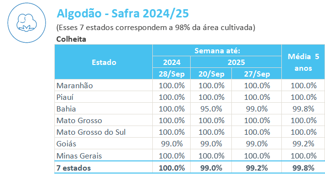 據(jù)巴西農(nóng)業(yè)部下屬的國家商品供應(yīng)公司CONAB,截至9月27日,巴西棉花收割率為99.2%,上周為99%,去年同期為100%,五年均值為99.8%。