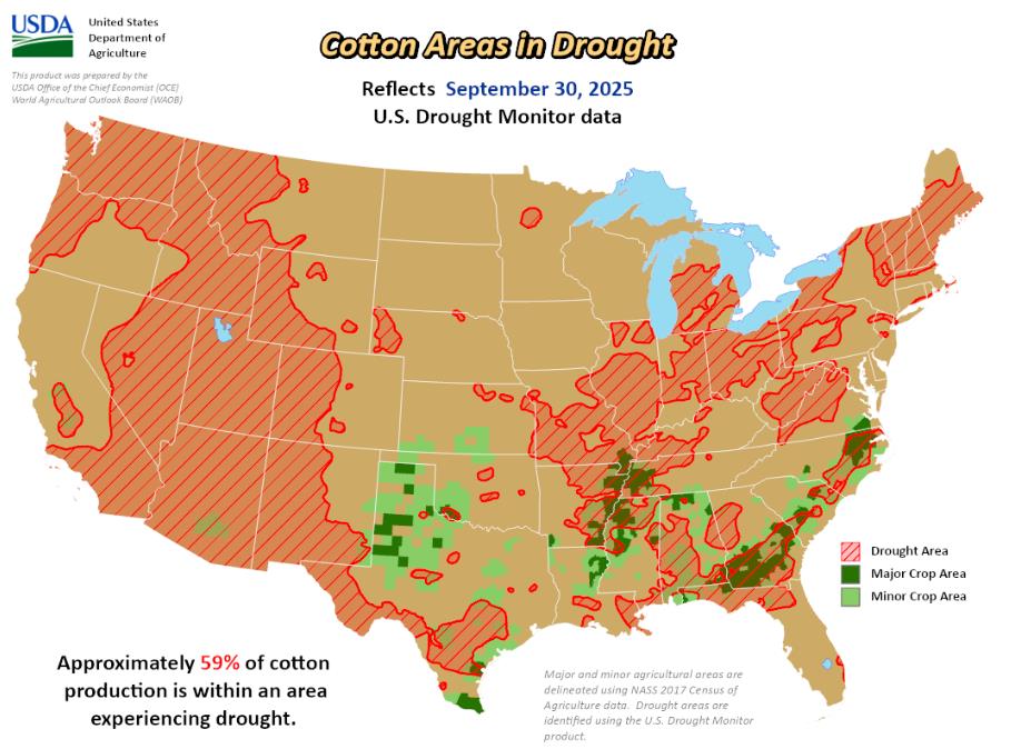 美國農業(yè)部(USDA)下屬的首席經濟學家辦公室(OCE)當?shù)貢r間周四根據(jù)當日發(fā)布的美國旱情監(jiān)測圖整理的美國農業(yè)旱情文件顯示,截至9月30日當周,大約59%美棉產區(qū)受到干旱影響,高于之前一周的49%。