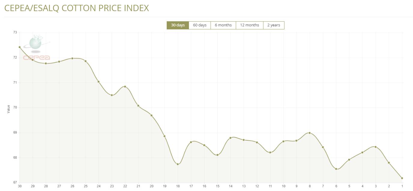 10月2日(周四),巴西CEPEA/ESALQ棉花價(jià)格指數(shù)報(bào)67.18美分/磅,較前一交易日下跌0.91%,較上月同期下跌1.83%。