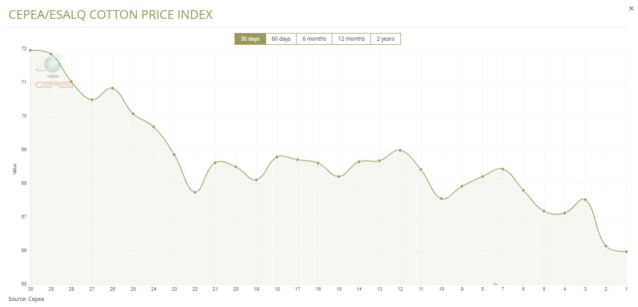 10月8日(周三),巴西CEPEA/ESALQ棉花價格指數(shù)報65.97美分/磅,較前一交易日下跌0.26%,較上月同期下跌3.59%。