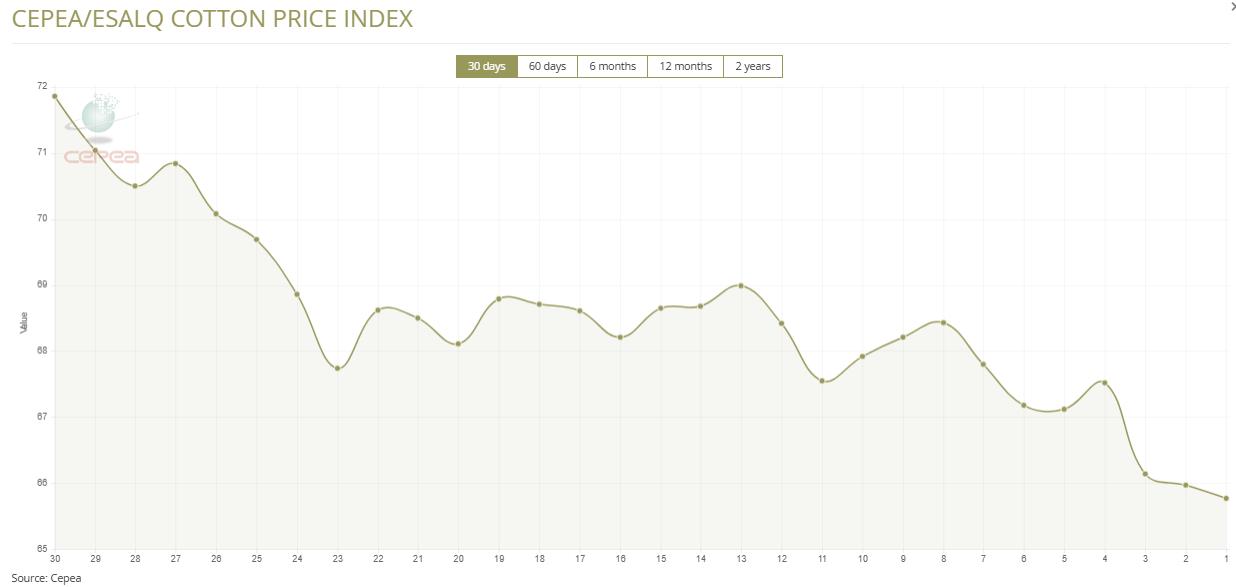 10月9日(周四),巴西CEPEA/ESALQ棉花價(jià)格指數(shù)報(bào)65.77美分/磅,較前一交易日下跌0.3%,較上月同期下跌3.89%。