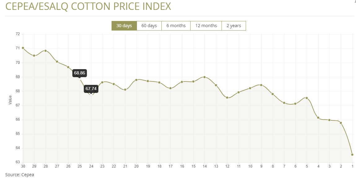 10月10日(周五),巴西CEPEA/ESALQ棉花價(jià)格指數(shù)報(bào)63.54美分/磅,較前一交易日下跌3.39%,較上月同期下跌7.15%。