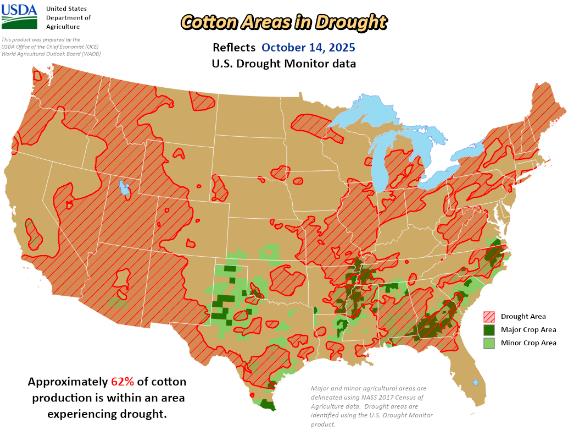 美國農(nóng)業(yè)部(USDA)下屬的首席經(jīng)濟學家辦公室(OCE)當?shù)貢r間周四根據(jù)當日發(fā)布的美國旱情監(jiān)測圖整理的美國農(nóng)業(yè)旱情文件顯示,截至10月14日當周,大約62%的美棉產(chǎn)區(qū)受到干旱影響,高于之前一周的61%。