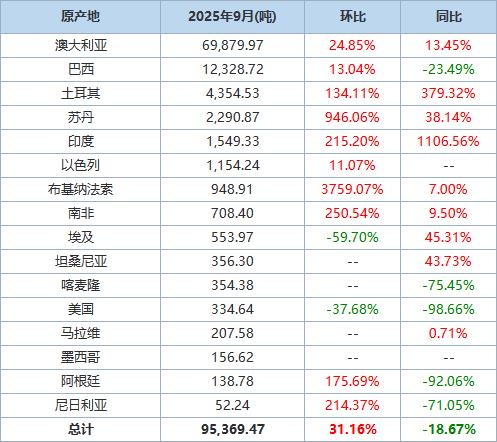 據(jù)海關(guān)統(tǒng)計(jì)數(shù)據(jù),2025年9月我國進(jìn)口棉花約10萬噸,環(huán)比增加約3萬噸,同比下降約18.7%。
