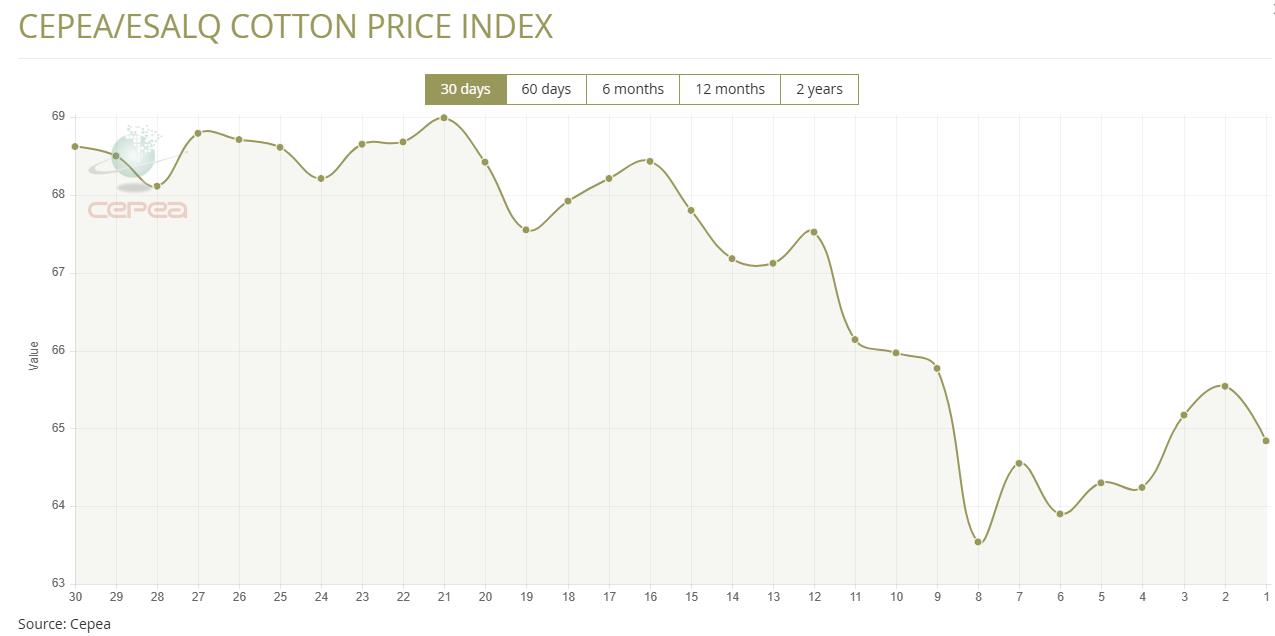 10月21日(周二),巴西CEPEA/ESALQ棉花價(jià)格指數(shù)報(bào)64.84美分/磅,較前一交易日下跌1.07%,較上月同期下跌5.25%。