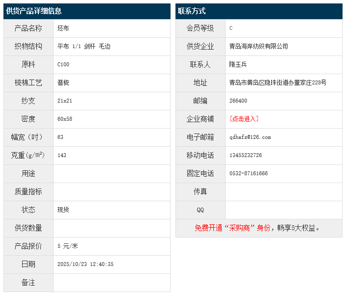 10月23日,青島海岸紡織有限公司純棉平布C100 21x21 60x58 63" 1/1 劍桿 毛邊,報價為5元/米,實際成交價以協(xié)商為準。[點擊查看詳情]