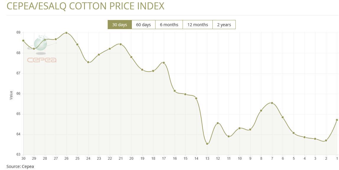 10月28日(周二),巴西CEPEA/ESALQ棉花價格指數(shù)報64.71美分/磅,較前一交易日上漲1.59%,較上月同期下跌5.44%。