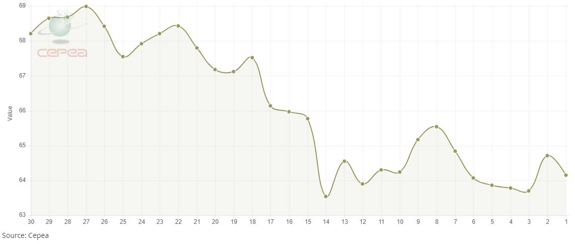 10月29日(周三),巴西CEPEA/ESALQ棉花價格指數(shù)報64.15美分/磅,較前一交易日下跌0.87%,較上月同期下跌6.25%。
