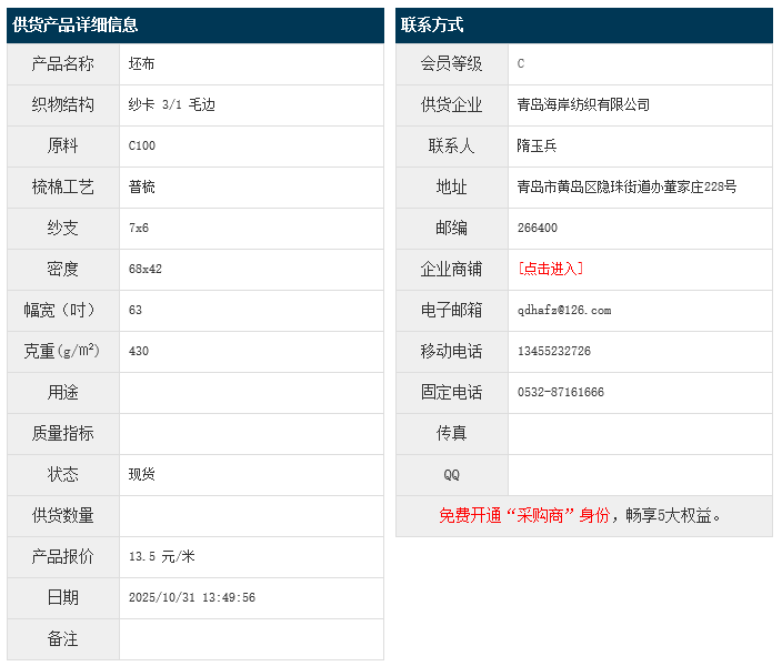 10月31日,青島海岸紡織有限公司純棉紗卡C100 7x6 68x42 63" 3/1 毛邊,報(bào)價(jià)為13.5元/米,實(shí)際成交價(jià)以協(xié)商為準(zhǔn)。[點(diǎn)擊查看詳情]