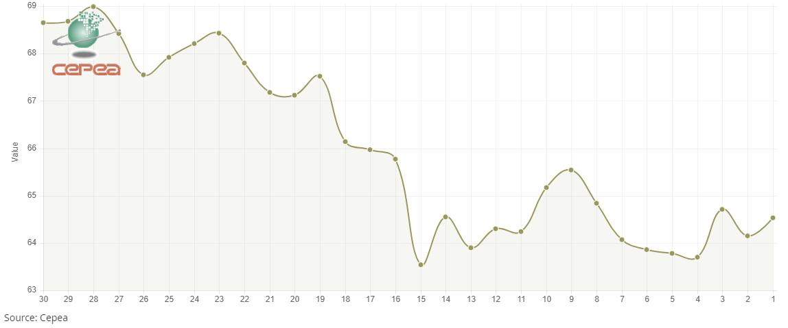 10月30日(周四),巴西CEPEA/ESALQ棉花價(jià)格指數(shù)報(bào)64.53美分/磅,較前一交易日上漲0.59%,較上月同期下跌5.70%。