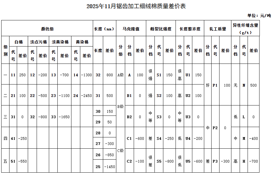 根據(jù)《中國棉花協(xié)會(huì)國產(chǎn)棉質(zhì)量差價(jià)表管理辦法》規(guī)定,現(xiàn)正式發(fā)布2025年11月《鋸齒加工細(xì)絨棉質(zhì)量差價(jià)表》、《皮輥加工細(xì)絨棉質(zhì)量差價(jià)表》、《長絨棉質(zhì)量差價(jià)表》(單位:元/噸)。