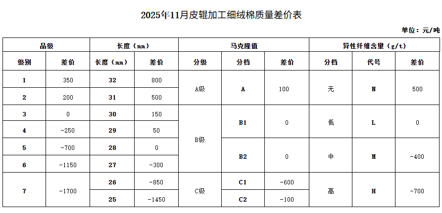 依據(jù)2025年10月的棉花公檢質(zhì)量數(shù)據(jù)、中國棉花協(xié)會(huì)質(zhì)量差價(jià)系統(tǒng)采集的加工企業(yè)銷售價(jià)和紡織廠到廠價(jià),及當(dāng)月的中國棉花價(jià)格指數(shù),并征求業(yè)內(nèi)相關(guān)專家的意見,與上月相比做出如下調(diào)整: