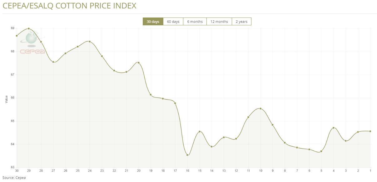 10月31日(周五),巴西CEPEA/ESALQ棉花價格指數報64.56美分/磅,較前一交易日上漲0.05%,較上月同期下跌5.66%。
