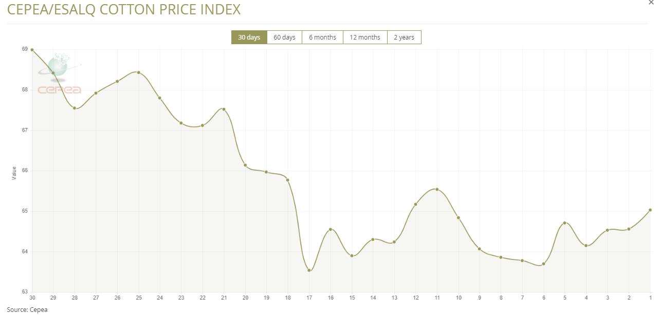 11月3日(周一),巴西CEPEA/ESALQ棉花價格指數(shù)報65.03美分/磅,較前一交易日上漲0.73%,較上月同期上漲0.73%。