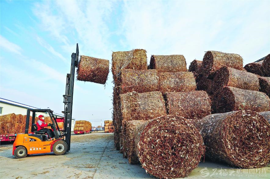 在位于烏蘇市的中城宏澤(新疆)生物科技有限公司,工人駕駛叉車(chē)碼放棉花秸稈(10月29日攝)。該公司以棉花秸稈為生產(chǎn)原料,制作全生物降解地膜、水稻專用膜、大棚膜等,讓當(dāng)?shù)?80多萬(wàn)畝棉花秸稈有了新用途。