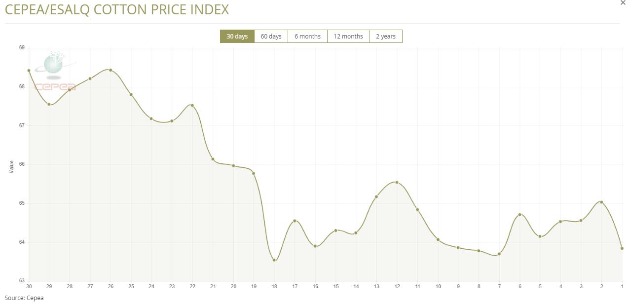 11月4日(周二),巴西CEPEA/ESALQ棉花價格指數(shù)報63.84美分/磅,較前一交易日下跌1.83%,較上月同期下跌1.12%。