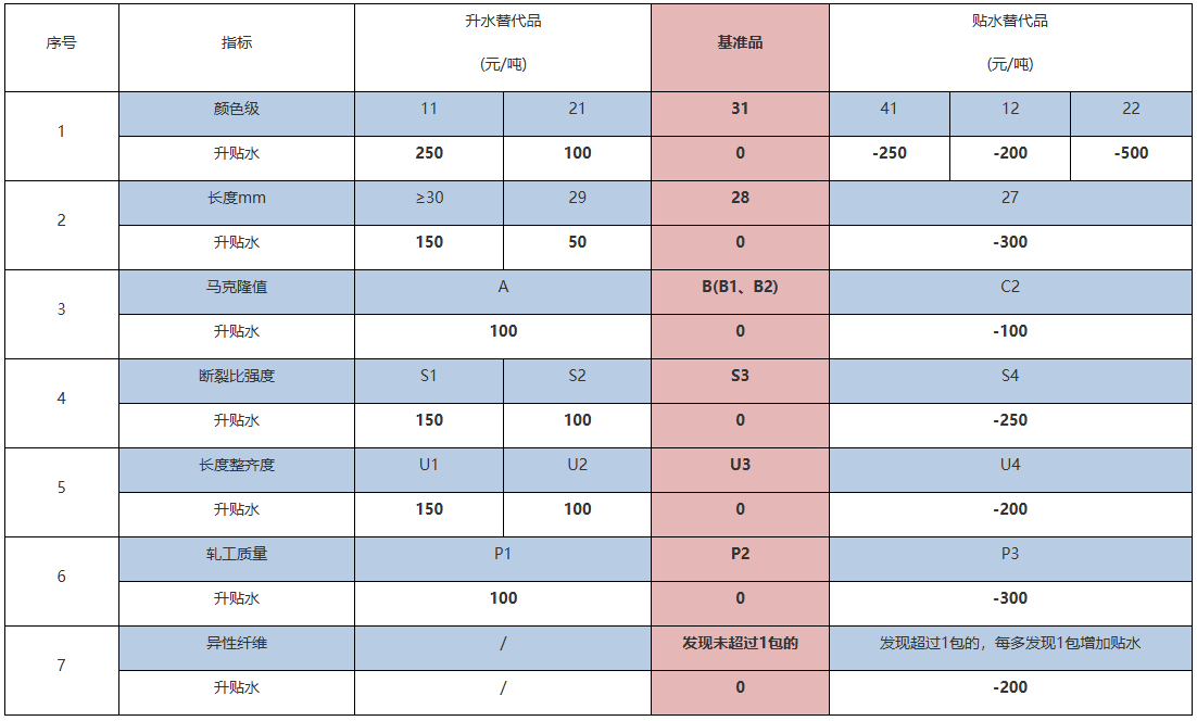 經(jīng)研究決定,現(xiàn)對棉花期貨替代交割品升貼水調(diào)整公告如下(見下表),自2026/27年度生產(chǎn)的棉花開始實施。