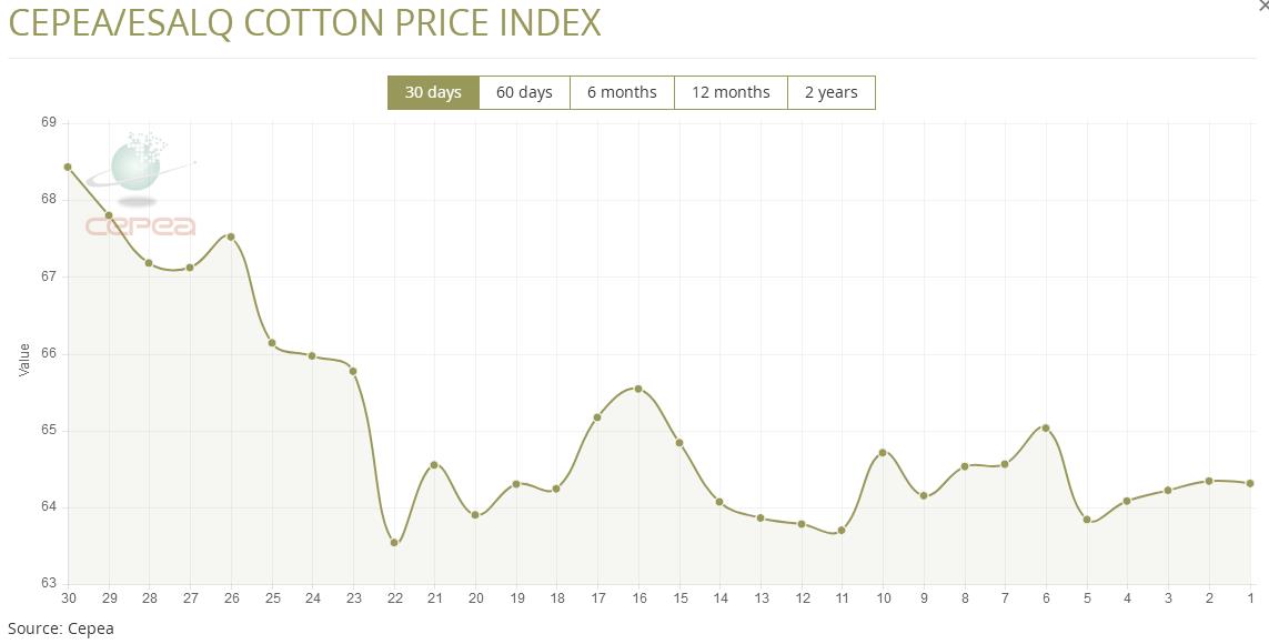 11月10日(周一),巴西CEPEA/ESALQ棉花價(jià)格指數(shù)報(bào)64.31美分/磅,較前一交易日下跌0.05%,較上月同期下跌0.39%。