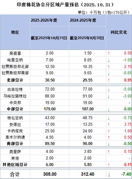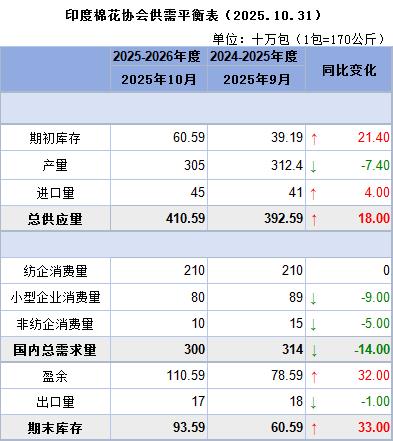 據(jù)該協(xié)會月度報告,2025年10月棉花總供應(yīng)量為931.7萬包,其中包括245.8萬包壓縮量、80萬包進口量、605.9萬包期初庫存。2025/26整個年度總供應(yīng)量預(yù)計為4105.9萬包,高于去年記錄的3925.9萬包。