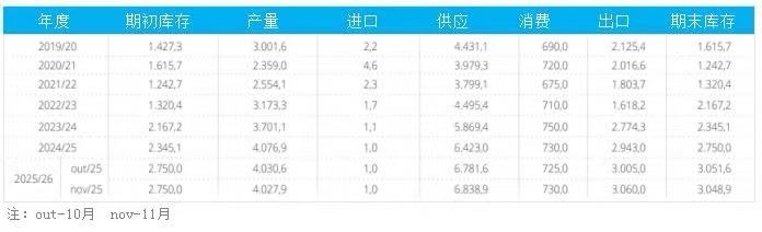 以下為巴西棉花供需平衡表(單位:千噸)