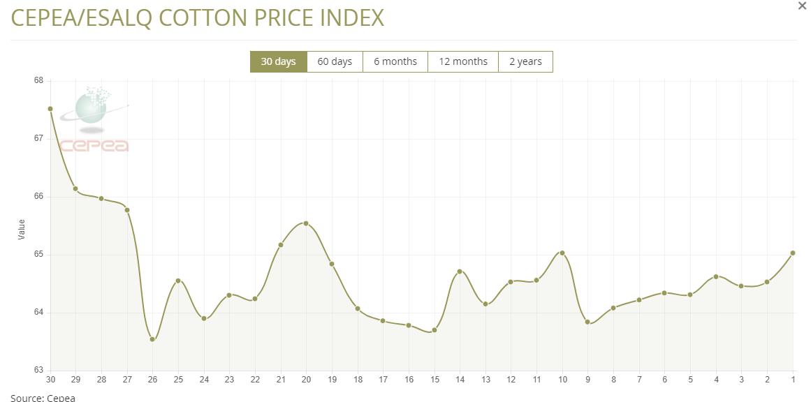 11月13日(周四),巴西CEPEA/ESALQ棉花價格指數(shù)報65.03美分/磅,較前一交易日上漲0.77%,較上月同期上漲0.73%。