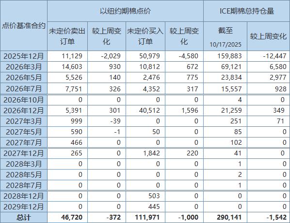 美國商品期貨交易委員會(CFTC)公布,截至10月17日,以ICE期棉2512合約點價未定價賣出訂單(UnfixedCallSales)較前周減少2029手至11129手。