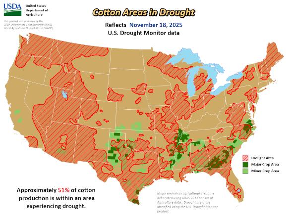 美國(guó)農(nóng)業(yè)部(USDA)下屬的首席經(jīng)濟(jì)學(xué)家辦公室(OCE)當(dāng)?shù)貢r(shí)間周四根據(jù)當(dāng)日發(fā)布的美國(guó)旱情監(jiān)測(cè)圖整理的美國(guó)農(nóng)業(yè)旱情文件顯示,截至11月18日當(dāng)周,大約51%美棉產(chǎn)區(qū)受到干旱影響,前一周為47%。