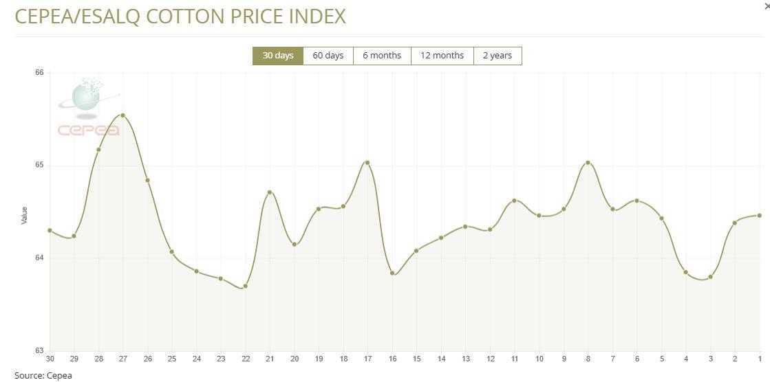 11月26日(周三),巴西CEPEA/ESALQ棉花價格指數(shù)報64.46美分/磅,較前一交易日上漲0.12%,較上月同期下降0.15%。