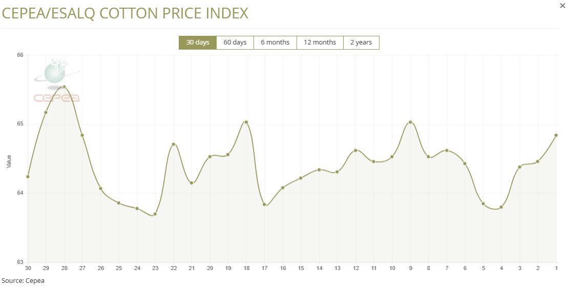 11月27日(周四),巴西CEPEA/ESALQ棉花價格指數(shù)報64.84美分/磅,較前一交易日上漲0.59%,較上月同期上漲0.43%。