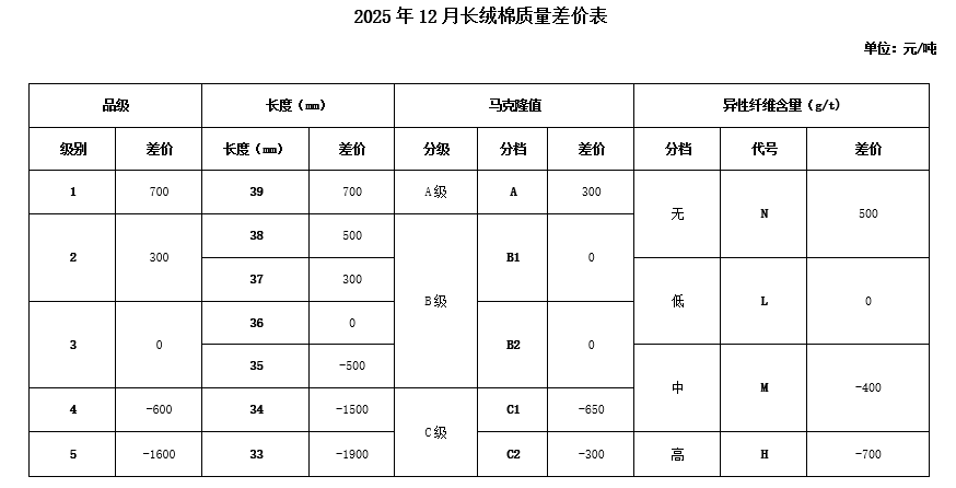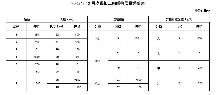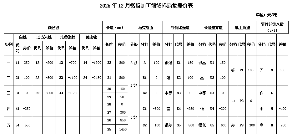 根據(jù)《中國(guó)棉花協(xié)會(huì)國(guó)產(chǎn)棉質(zhì)量差價(jià)表管理辦法》規(guī)定,現(xiàn)正式發(fā)布2025年12月《鋸齒加工細(xì)絨棉質(zhì)量差價(jià)表》、《皮輥加工細(xì)絨棉質(zhì)量差價(jià)表》、《長(zhǎng)絨棉質(zhì)量差價(jià)表》(單位:元/噸)。