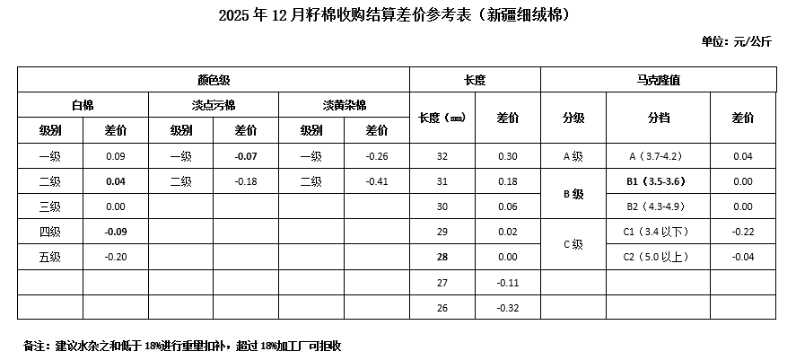 依據(jù)中國棉花協(xié)會(huì)發(fā)布的2025年12月《鋸齒加工細(xì)絨棉質(zhì)量差價(jià)表》和2025年9-11月新疆籽棉平均公定衣分率,折算得出籽棉收購差價(jià),與上月相比,做如下調(diào)整:
