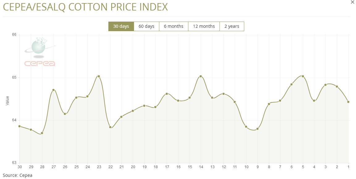 12月4日(周四),巴西CEPEA/ESALQ棉花價格指數報64.43美分/磅,較前一交易日下滑0.56%,較上月同期下跌0.92%。