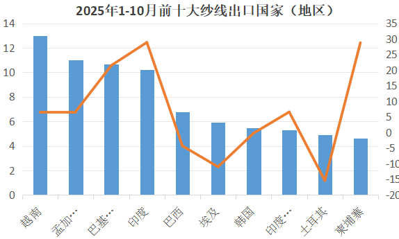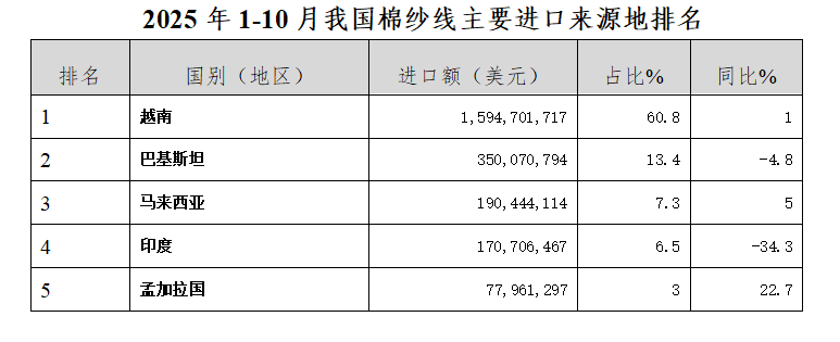 從進(jìn)口來源看,進(jìn)口棉紗前5大來源地全部來自亞洲地區(qū),前五大來源地合計(jì)占比90%。2025年1-10月自越南進(jìn)口棉紗線71.7萬噸,同比增長10.3%,占棉紗線進(jìn)口總量60.4%,進(jìn)口金額達(dá)15.9億,同比增1%,占進(jìn)口總額的61.1%。自馬來西亞和孟加拉進(jìn)口棉紗線增長5%和22.7%,自巴基斯坦和印度進(jìn)口棉紗線下降4.8%和34.4%。