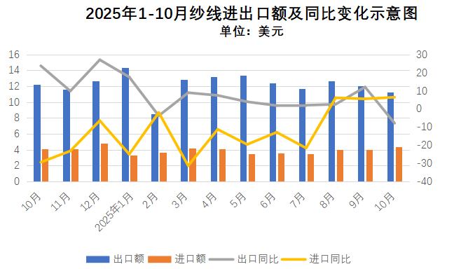 10月紗線面料出口由正轉(zhuǎn)負(fù),進(jìn)口持續(xù)下降