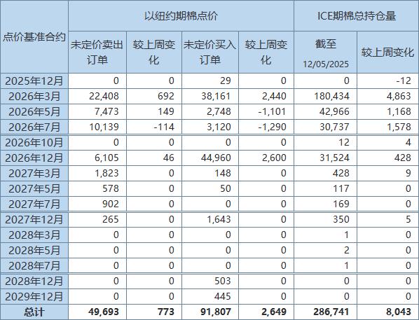 美國(guó)商品期貨交易委員會(huì)(CFTC)公布,截至12月5日,以ICE期棉2026年3月合約點(diǎn)價(jià)未定價(jià)賣(mài)出訂單(UnfixedCallSales)較前周增加692手至22408手。