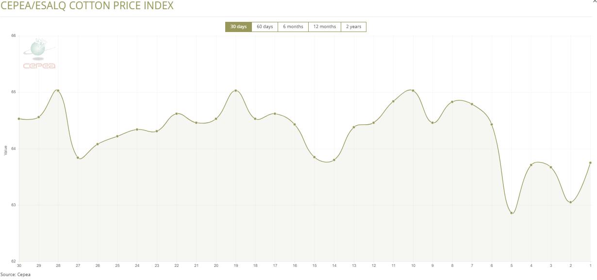 12月11日(周四),巴西CEPEA/ESALQ棉花價(jià)格指數(shù)報(bào)63.75美分/磅,較前一交易日上漲1.11%,較上月同期下滑1.97%。
