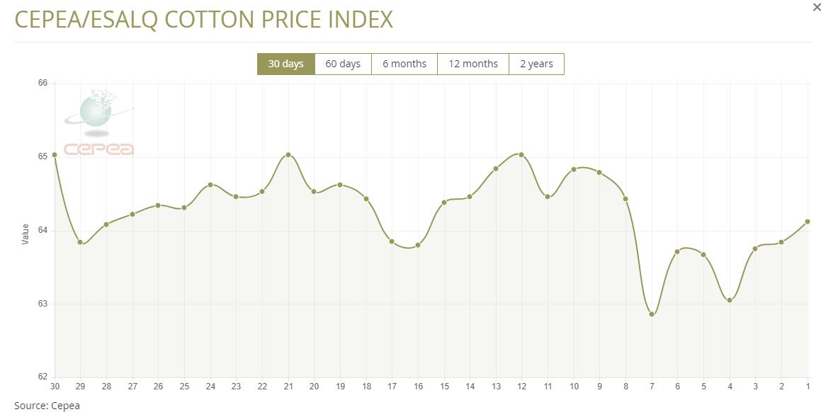 12月15日(周一),巴西CEPEA/ESALQ棉花價格指數(shù)報64.12美分/磅,較前一交易日上漲0.44%,較上月同期下滑1.40%。