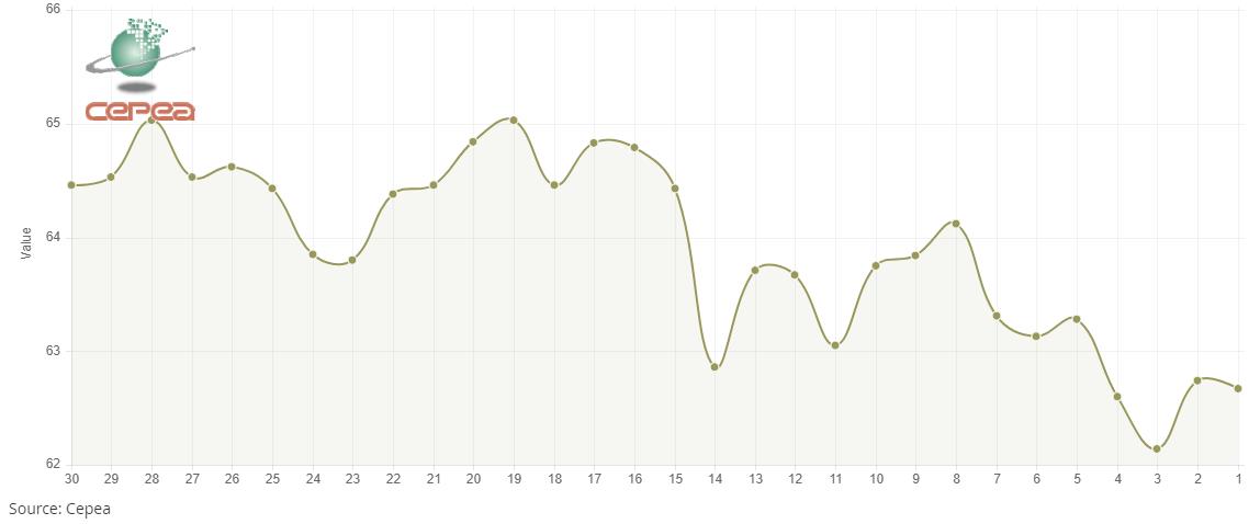 12月26日(周五),巴西CEPEA/ESALQ棉花價(jià)格指數(shù)報(bào)62.67美分/磅,較前一交易日下跌0.11%,較上月同期下滑3.63%。