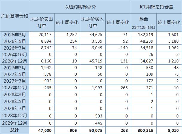 美國商品期貨交易委員會(CFTC)公布,截至12月19日,以ICE期棉2026年3月合約點價未定價賣出訂單(UnfixedCallSales)較前周減少1252手至20117手。