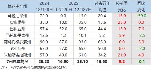 12月29日(周一),巴西國家商品供應公司(Conab)公布的數(shù)據(jù)顯示,截至2025年12月27日當周,2025/26年度巴西棉花種植率為25.1%,前周為16.9%,上年同期為25.2%,五年均值為15.6%。