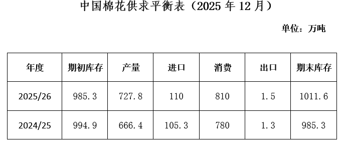 12月26日,國家統(tǒng)計局公布2025年全國棉花產(chǎn)量664.1萬噸,同比增長7.7%。其中新疆產(chǎn)量616.5萬噸,增長8.4%;長江流域22.0萬噸,下降0.7%;黃河流域20.3萬噸,下降1.5%。中國棉花協(xié)會預測,2025/26年度全國棉花產(chǎn)量727.8萬噸,同比增長9.2%;進口量110萬噸,同比增長4.5%;消費量810萬噸,同比增長3.8%;期末庫存1011.6萬噸,同比增長2.7%。