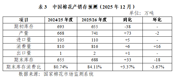 本期將中國(guó)棉花產(chǎn)銷存預(yù)測(cè)表中2025/26年度產(chǎn)量較上期下調(diào)2萬噸、消費(fèi)量上調(diào)16萬噸、期末庫存下調(diào)18萬噸、期末庫存消費(fèi)比下調(diào)3.67個(gè)百分點(diǎn)。