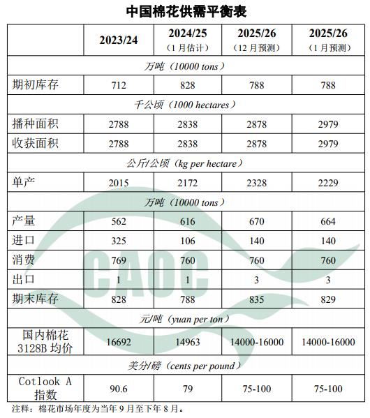 2025/26年度中國(guó)棉花生產(chǎn)預(yù)測(cè)與國(guó)家統(tǒng)計(jì)局公布數(shù)據(jù)基本一致,本月數(shù)據(jù)根據(jù)國(guó)家統(tǒng)計(jì)局公告進(jìn)行微調(diào)。其中,棉花播種面積調(diào)至2979千公頃,較上年增5.0%;單位面積產(chǎn)量調(diào)至每公頃2229公斤,較上年增2.6%;總產(chǎn)量調(diào)至664萬(wàn)噸,較上年增7.7%。本月進(jìn)口量和消費(fèi)量預(yù)測(cè)數(shù)據(jù)維持上月不變,期末庫(kù)存調(diào)減至829萬(wàn)噸。受紡織廠春節(jié)前補(bǔ)庫(kù)需求影響,皮棉銷售進(jìn)度明顯加快。據(jù)中國(guó)棉花網(wǎng)數(shù)據(jù),截至1月8日,全國(guó)棉花加工率94.5%,同比減0.5個(gè)百分點(diǎn);銷售率55.6%,同比增24.1個(gè)百分點(diǎn)。